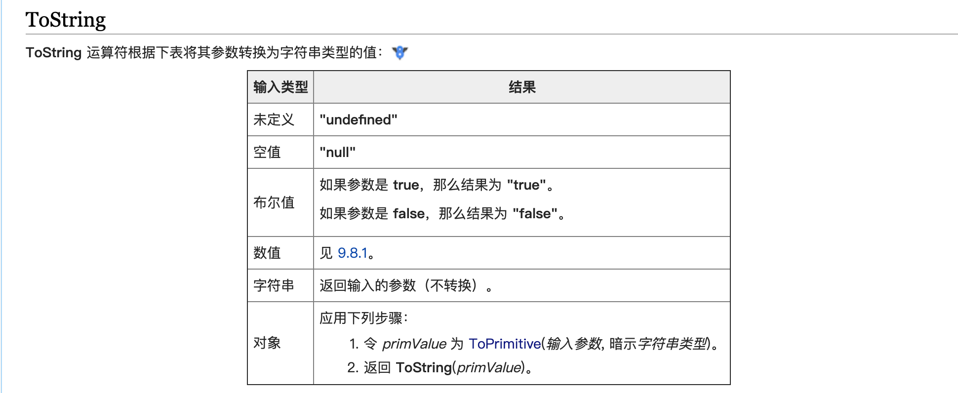 调用ToPrimitive内部操作时,如果传入基本值(未定义,空值,布尔值,数值,字符串),不会进行任何操作,直接返回,如果传入的是对象,调用对象的 [[DefaultValue]] 内部方法(把接收到的暗示类型传进去)。