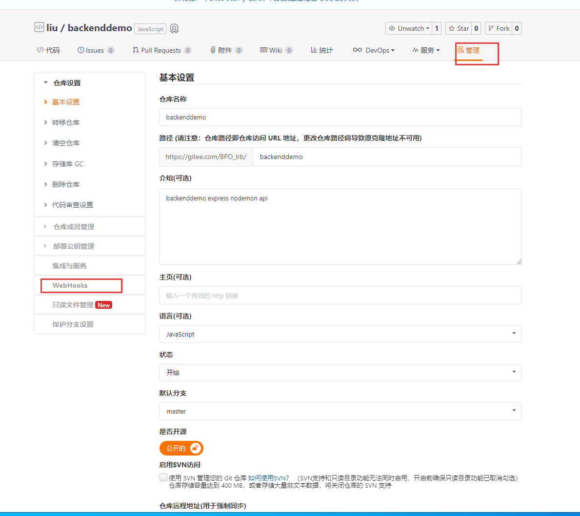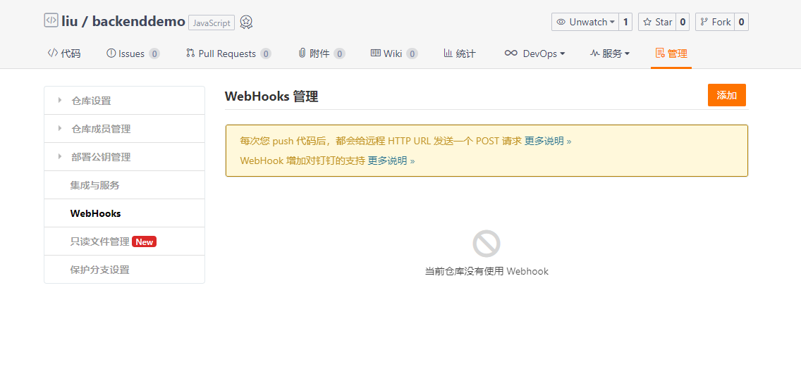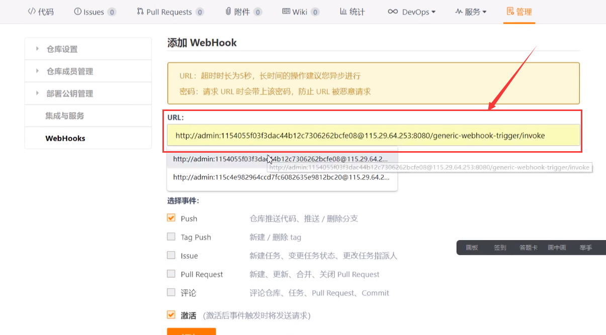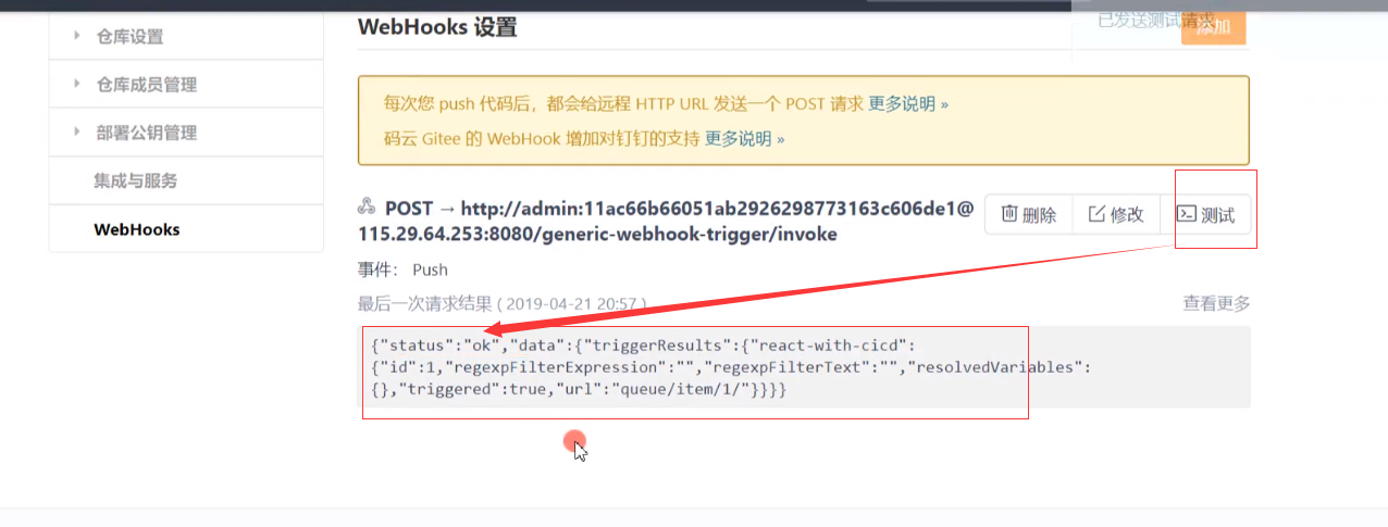 3、 在源码仓库 webhook URL 填写好以后,可以测试是否成功