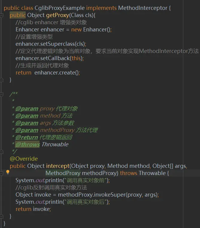 这里用CGLIB的加强者Enhancer,通过设置超类的方法(setSuperclass),然后通过setCallback方法设置代理类。this意味着用当前对象实现接口MethodInterceptor的方法--intercept,然后返回代理对象。当前类的intercept方法就是其代理逻辑方法,参数内容见代码注解。