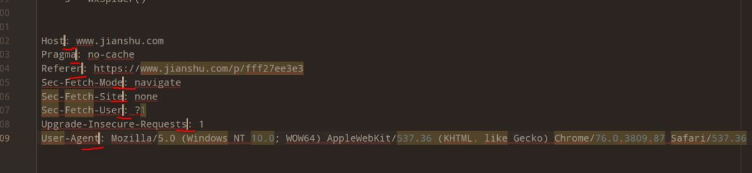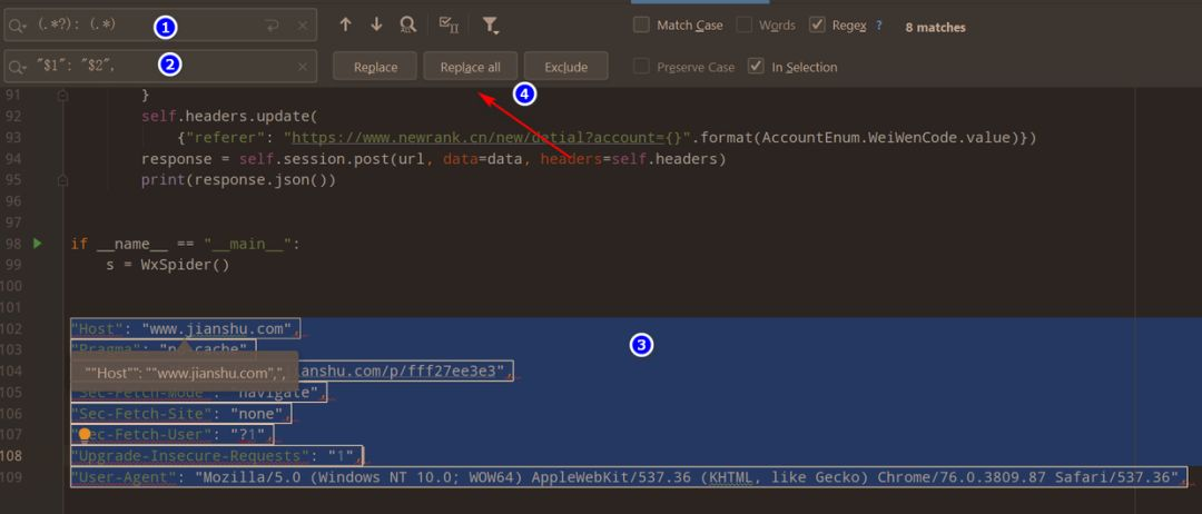 正则替换指的是利用 Pycharm 的 ctrl+R 替换功能,下面带大家一步一步来演示该操作,我们将浏览器的请求头复制到 Pycharm 中,如下面所示