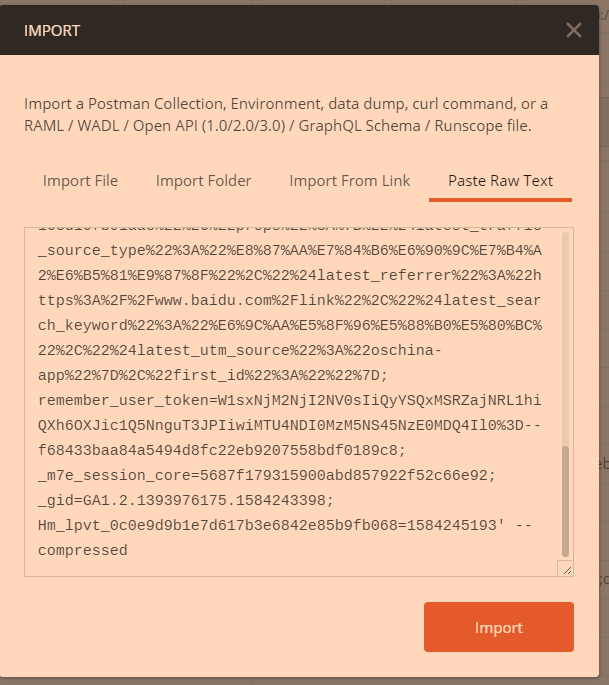 然后打开 postman,选择左上角的 New 旁边的 Import 按钮 ,粘贴我们刚 copy 的内容