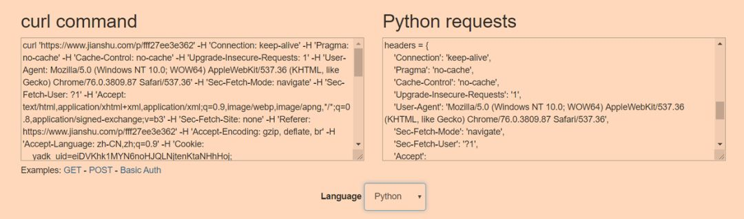 如上图, headers 已生成,不仅支持 Python 还支持其他语言,强大👍