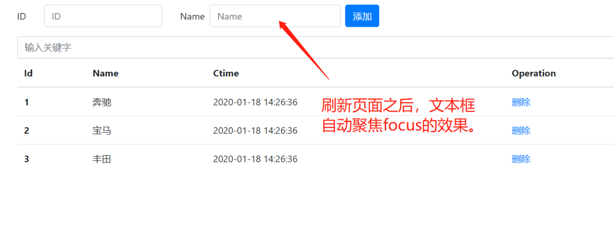 可以看到上面的输入框在刷新页面并没有进行自动聚焦,那么这时候可以使用自定义一个focus()方法来处理。
