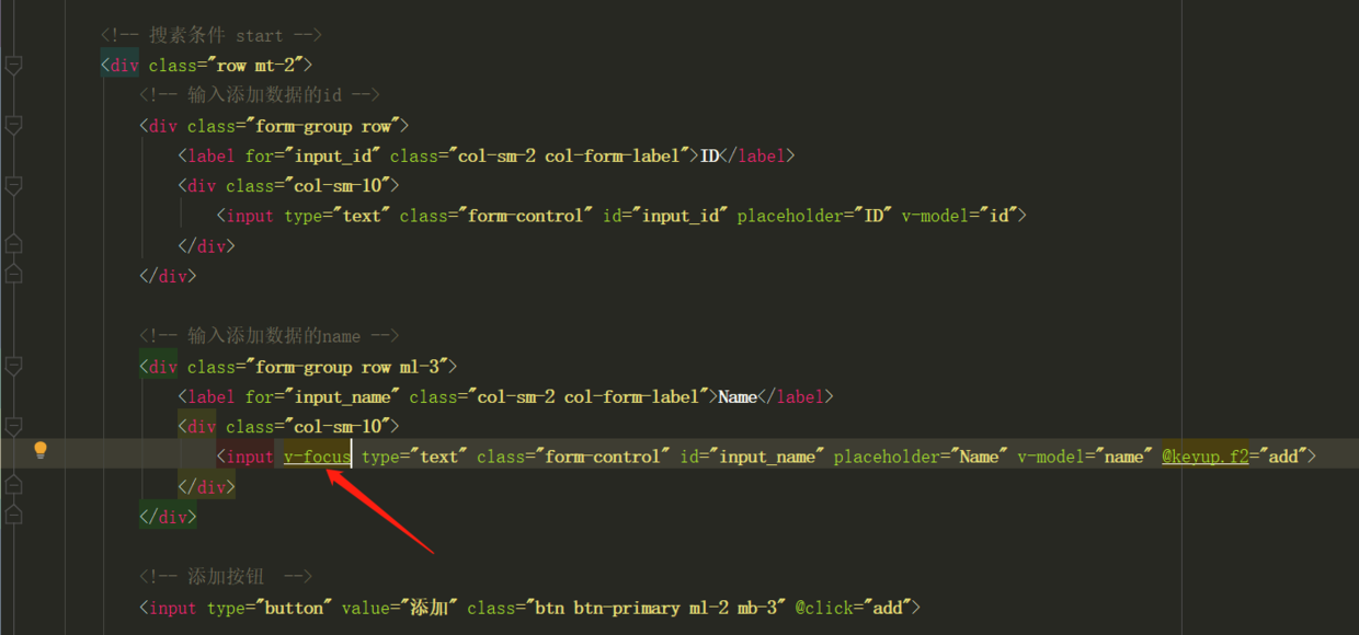 然后你可以在模板中任何元素上使用新的 v-focus 属性,如下: