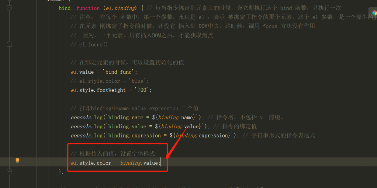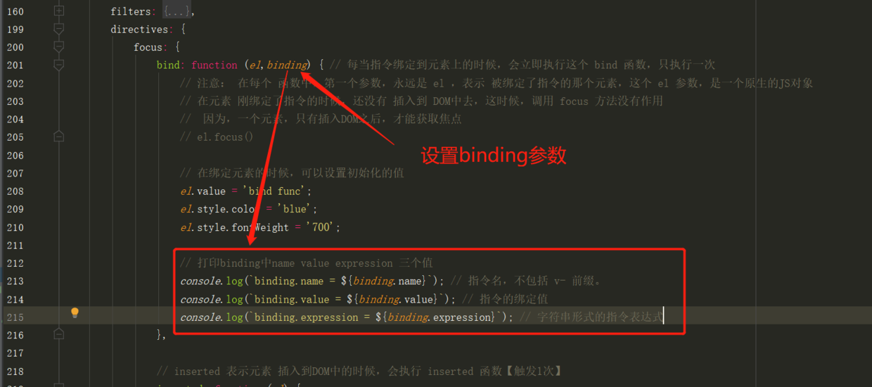 bind: function (el,binding) { // 每当指令绑定到元素上的时候,会立即执行这个 bind 函数,只执行一次