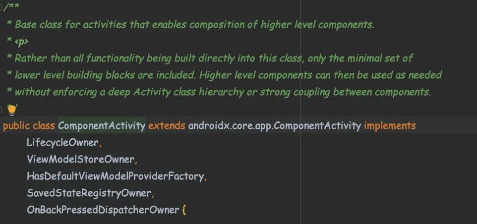 可以看到 ComponentActivity 继承了 androidx.core.app.ComponentActivity(在 fragment 库中),并且最初仅实现了LifecycleOwner 接口