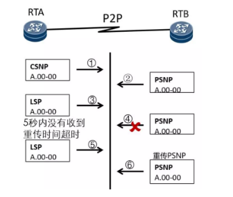 • 假定RTB向RTA索取相应的LSP,此时向RTA发送PSNP。RTA发送RTB请求的LSP的同时启动LSP重传定时器,并等待RTB发送PSNP作为收到LSP的确认。