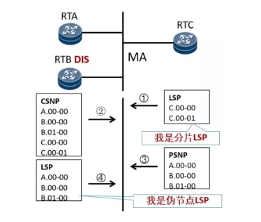 • 该网段中的DIS会把收到RTC的LSP加入到LSDB中,并等待CSNP报文定时器超时(DIS每隔10秒发送CSNP报文)并发送CSNP 报文,进行该网络内的LSDB同步。