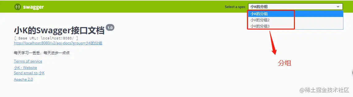 在团队协同开发的过程中,可以为自己配置分组,同时设定扫描某个指定包。通过切换分组查看指定的接口