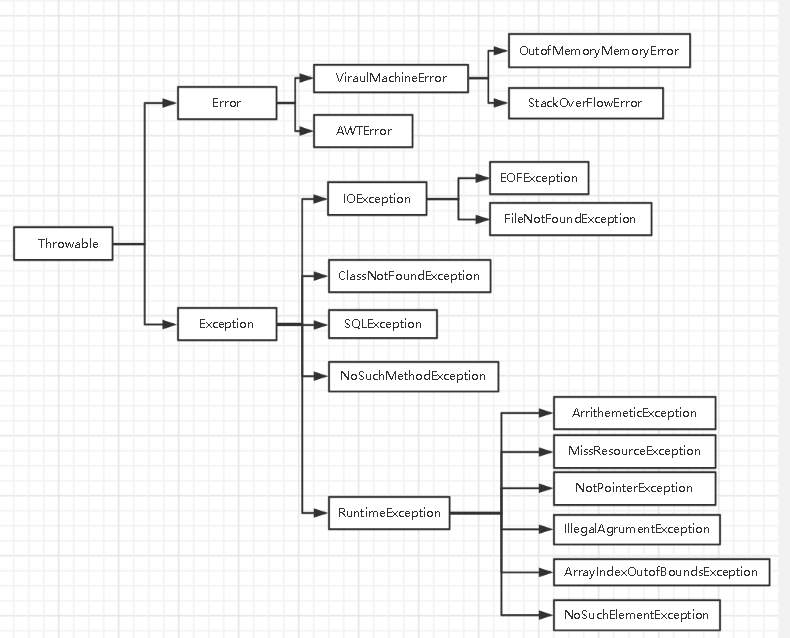 如图所示:Thowable是所有异常的父类,它有两个子类Error和Exception,除了Error及其子类和RuntimeException及其子类都属于检查异常,常见的检查异常有IOException、SQLException等