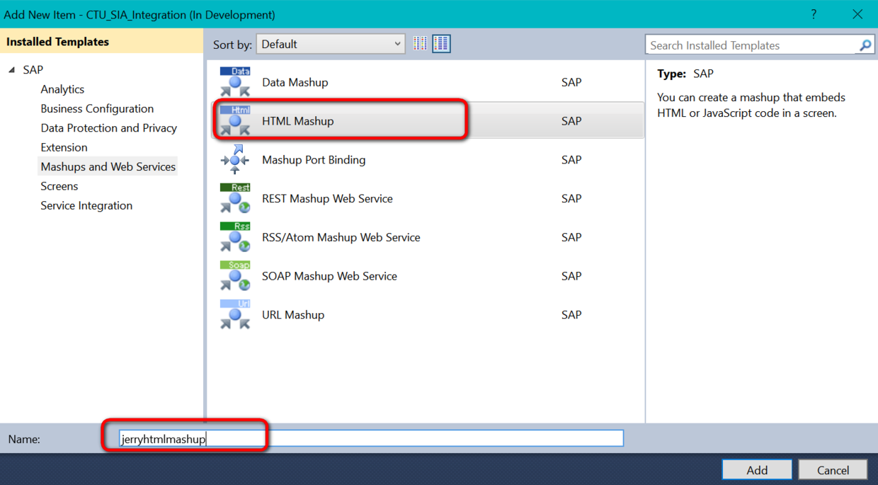 在SAP Cloud for Customer的Cloud Application Studio里,在Mashups and Web Services的新建菜单里,创建一个HTML Mashup: