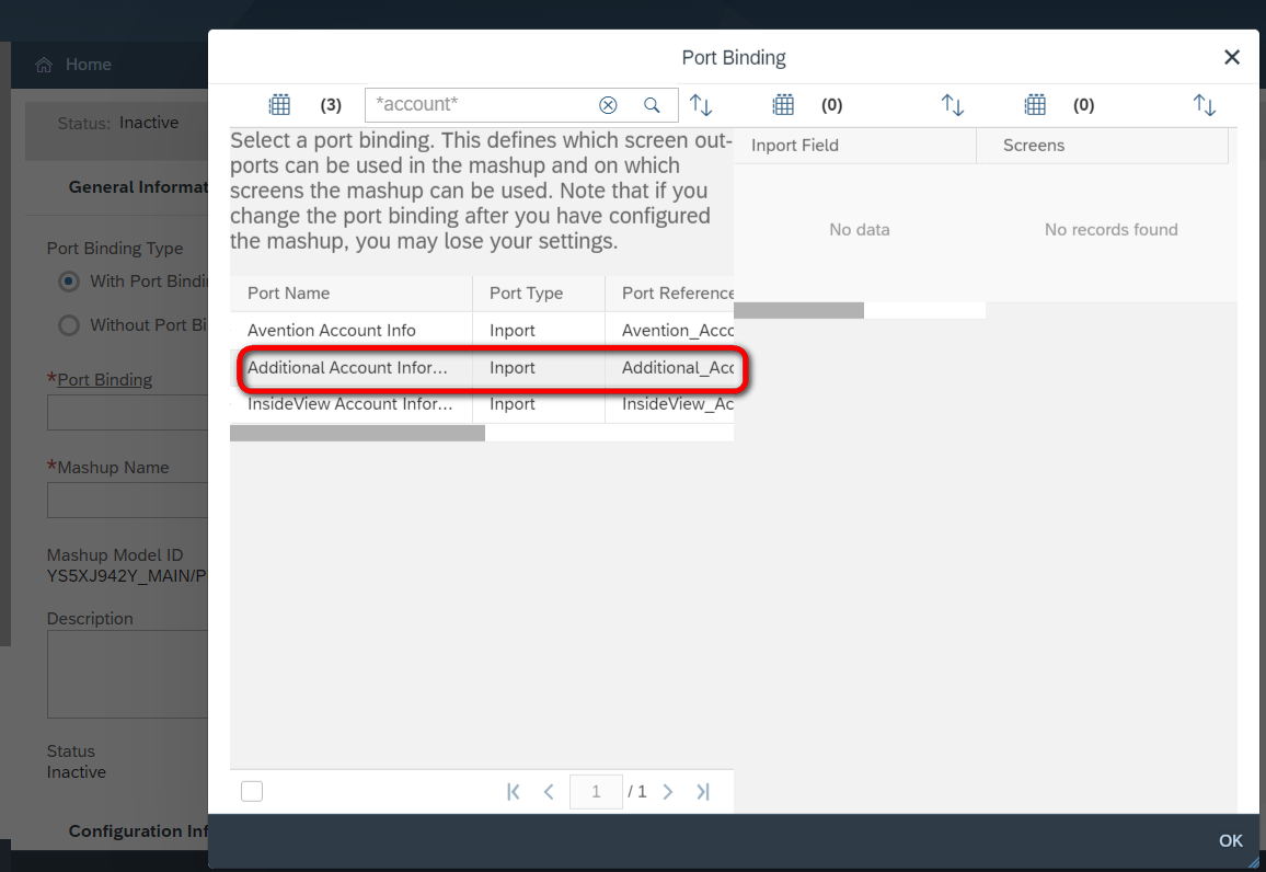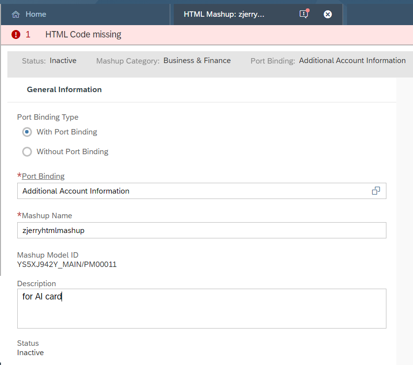 我的port binding选择additional Account information,这意味着该html mashup可以插入到Account TI页面去: