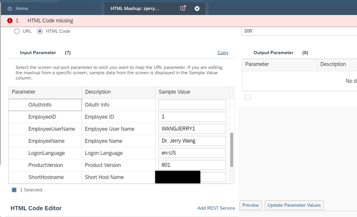 Input Parameter里,可以选择将SAP提供的一些输入参数,传入到html mashup里使用: