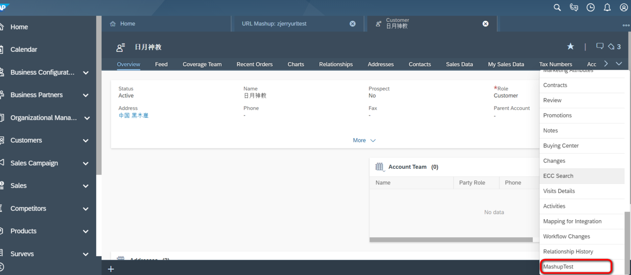 保存之后,在Account TI页面里,看到mashupTest这个新的tab,点击之后: