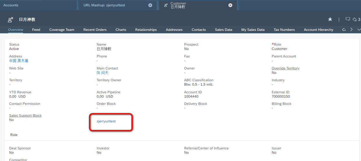 插入之后,在Account TI页面会看到一个外观为超链接的新字段,该字段就是url mashup的外在表现,点击之后,就弹出一个新的页面,打开了https://www.sap.com:
