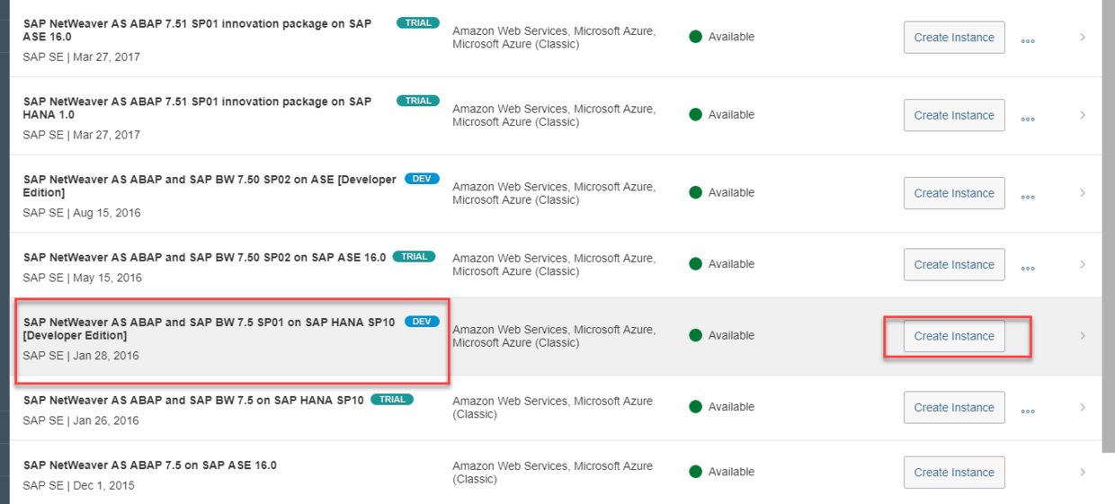 在结果里选择SAP NetWeaver AS ABAP and SAP BW 7.5 SP01 on SAP HANA SP10,点击Create instance: