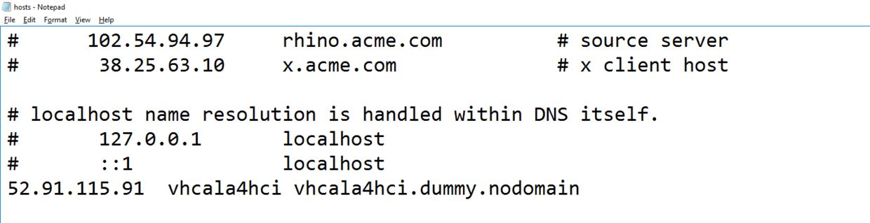 在操作系统的hosts文件里新增一条记录: 刚刚抄下来的IP地址 vhcala4hci vhcala4hci.dummy.nodomain