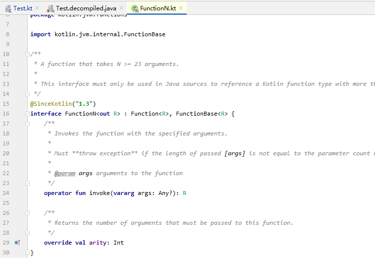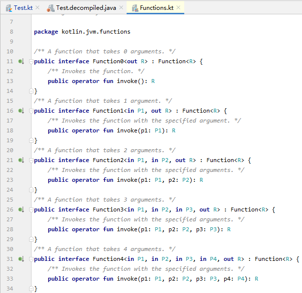 从转换的 Java 代码可以看出来,我们所写的闭包被转换成了 Function1 的类,实际上 Function1 是 Kotlin 标准库中的接口,我们打开 Functions.kt 文件: