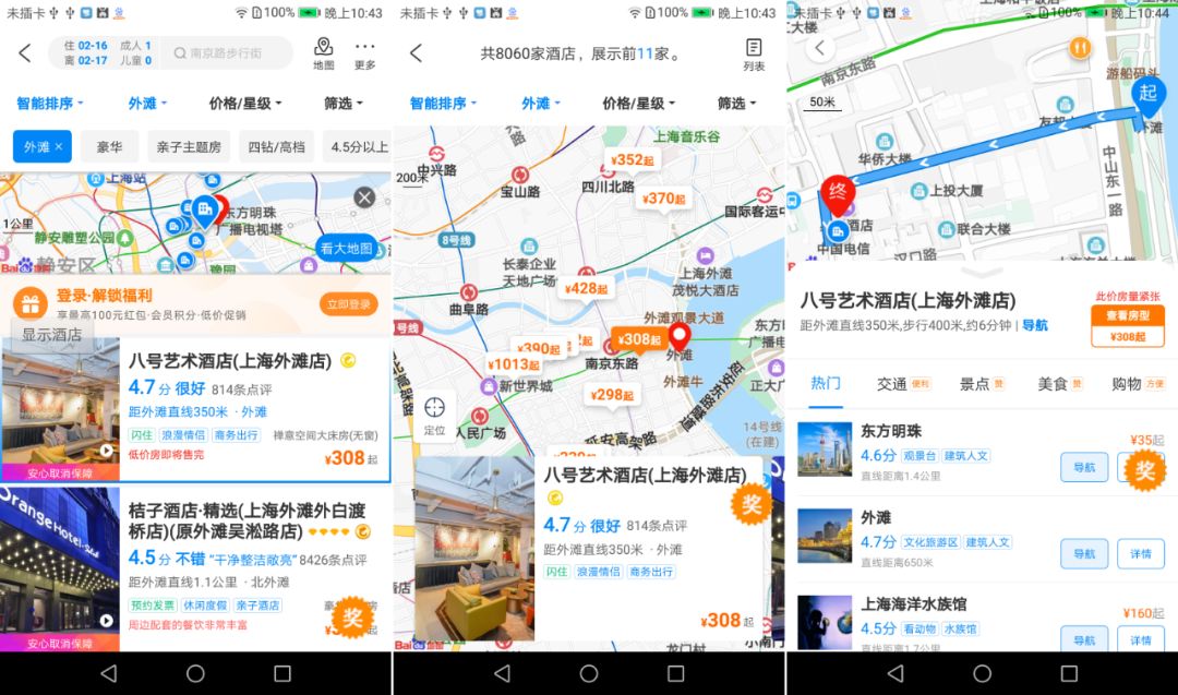 可视化的地图交互界面能够给到用户最直观的地理位置信息感受,根据用户主观心理选择的价格高低、距离远近、交通方式、生活购物等多个因素,帮助用户迅速找到目的地区域最适合自己的酒店。无论是直观体验上,还是用户习惯上,地图功能都是携程酒店整体业务不可或缺的一部分。