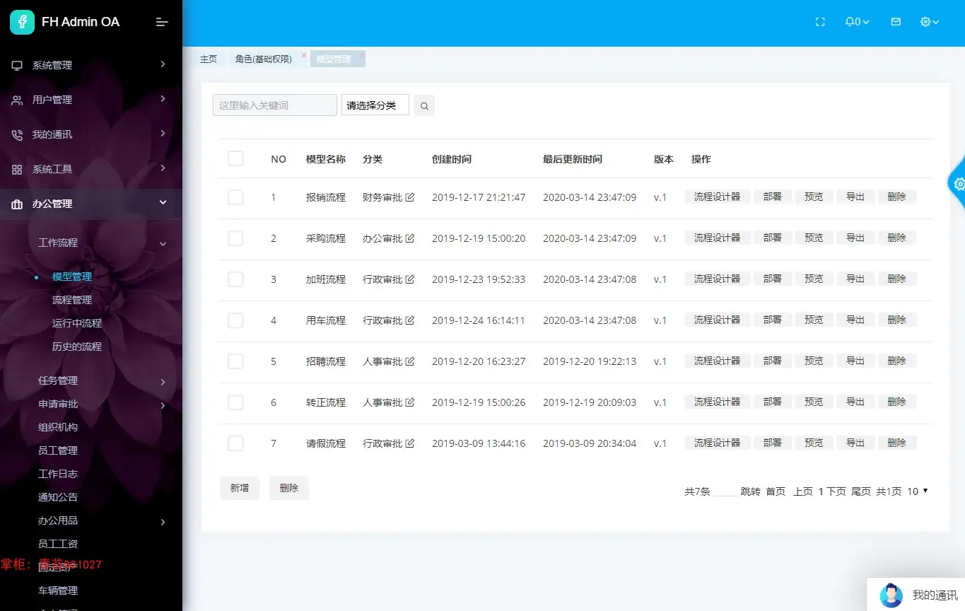 1.模型管理 :web在线流程设计器、预览流程xml、导出xml、部署流程