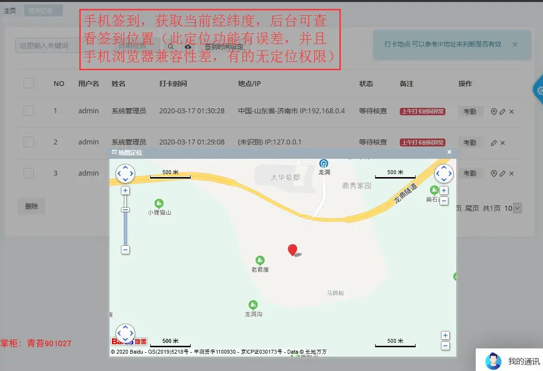 46. 签到记录:在手机端打卡签到,参考打卡IP、地点判断打卡位置,设定上下班等时间