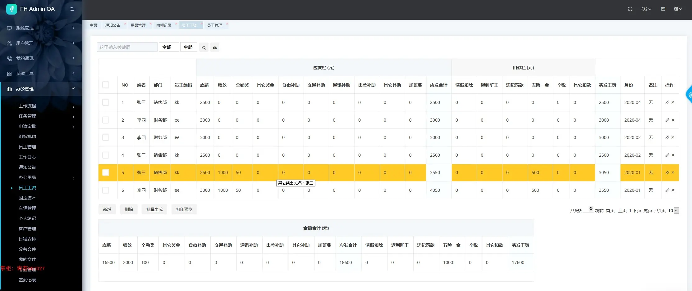 37. 员工工资:根据年月份,单个、批量生成工资单,参考考勤,打印工资单,计算总金额