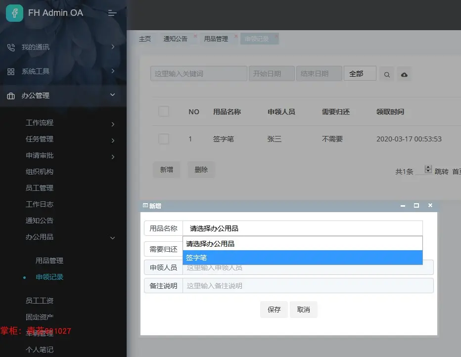 36. 申领记录:办公用品下级菜单,添加申领用品信息,备注是否需要归还,便于追还