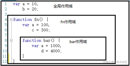 作用域有上下级关系,上下级关系的确定就看函数是在哪个作用域下创建的。如上,fn作用域下创建了bar函数,那么“fn作用域”就是“bar作用域”的上级。