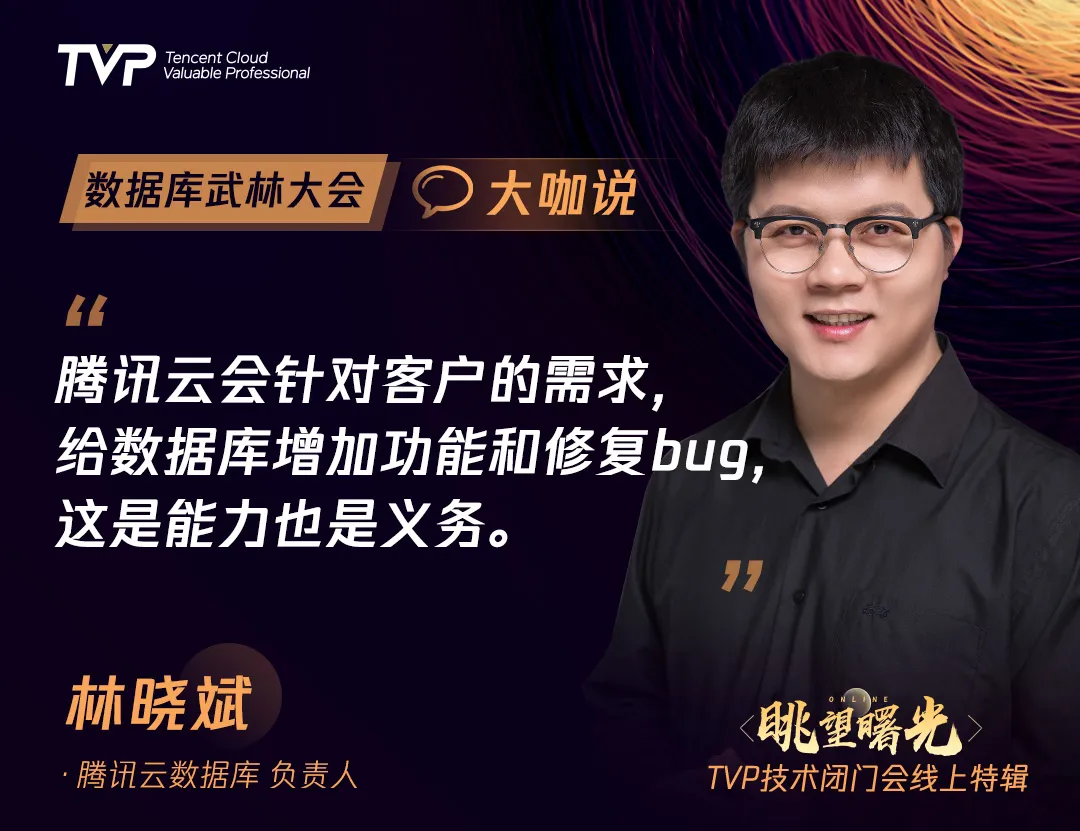 腾讯云数据库负责人林晓斌在点评环节指出了全面云计算时代下,集成数据库等产品的云服务在维护客户实例时,需要关注的客户实际需求。在他看来,不管是官方的问题还是云服务的问题,都是腾讯云团队需要为客户解决的问题,腾讯云会针对客户的实际需求,给数据库增加功能、修复bug,这是能力,也是义务。