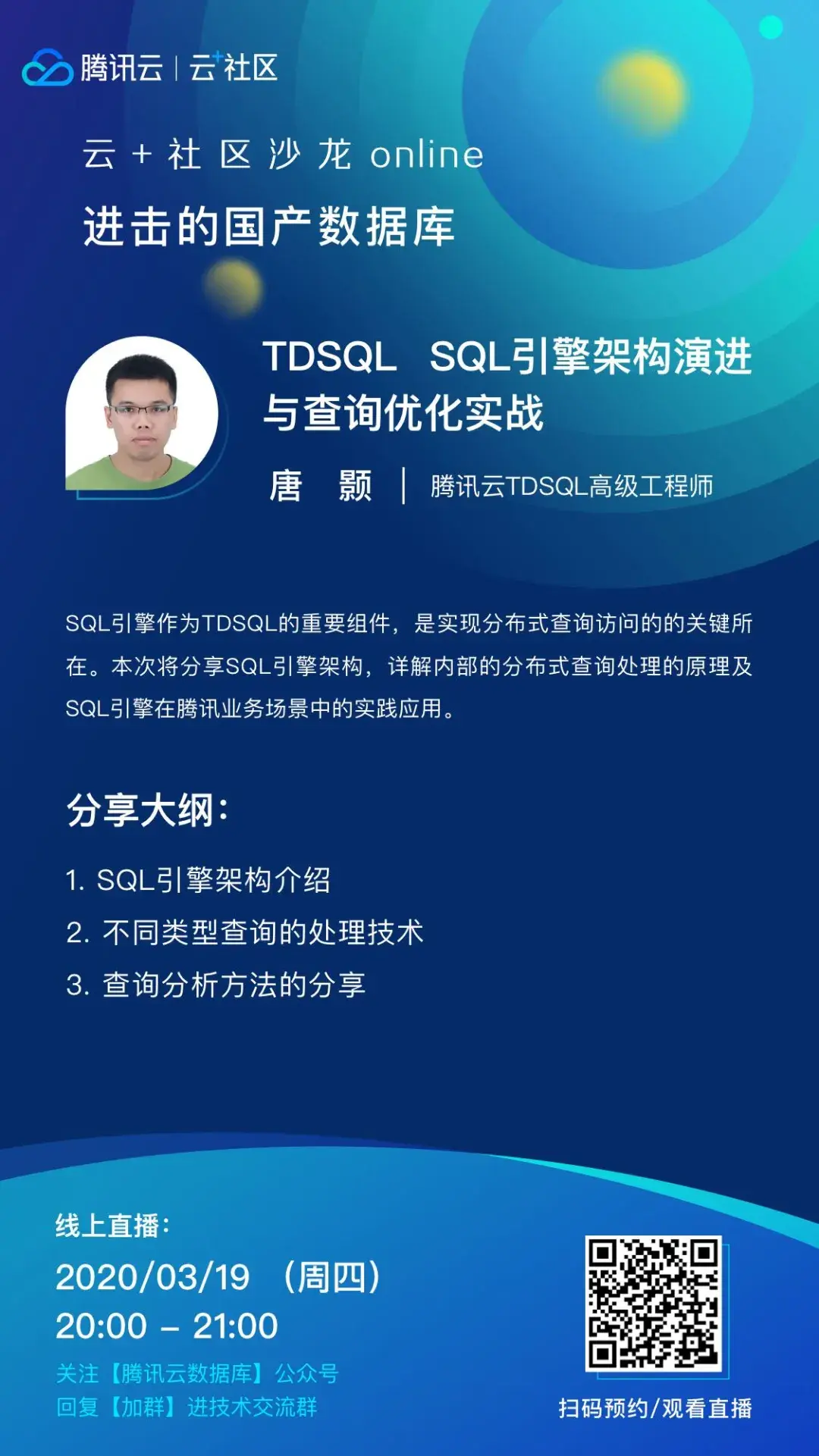 直播预告 | TDSQL SQL引擎架构演进与查询优化实践 腾讯云数据库 2020-03-20 269 阅读1分钟 直播互动福利:每晚直播间也同样会送出多份腾讯公仔,更有腾讯徽章、腾讯云代金券等好礼送上!快快预约报名吧!扫码关注后回复「加群」提前加入沙龙交流群