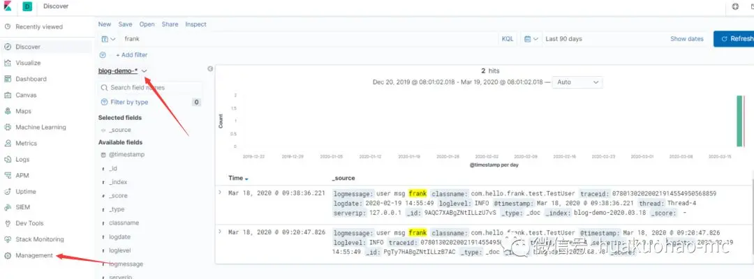 在Kibana的左侧边栏找到management,点击进去之后,找到kibana的索引管理,添加blog-demo索引(Logstash中配置的索引名称)。添加完成后就可以搜索了。下面我放一个截图,大家感受一下,重点关注地方都用箭头标出了。