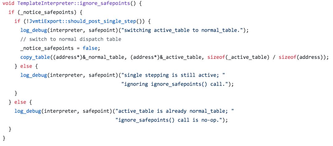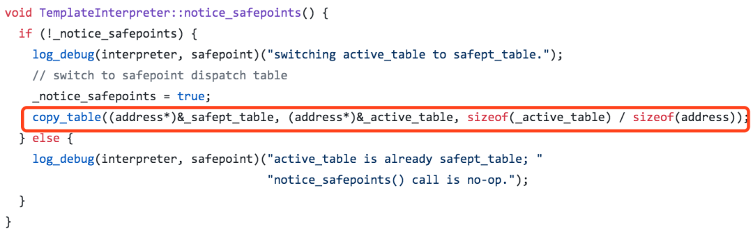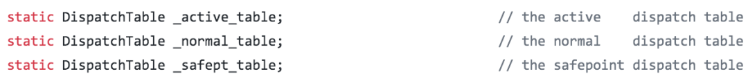 在进入安全点的代码中,其中有一项工作就是替换上面生效的字节码派遣表: