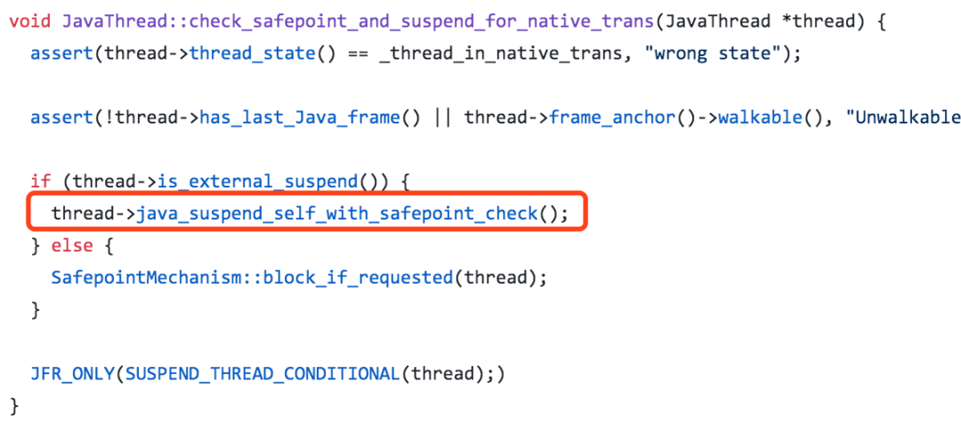 对于正在进行JNI调用的线程,SafepointSynchronize::begin中不需要特别的操作。执行native代码的Java线程,从JNI接口返回时将会主动去检查是否需要挂起自己。