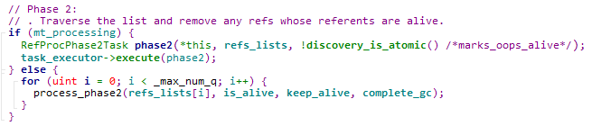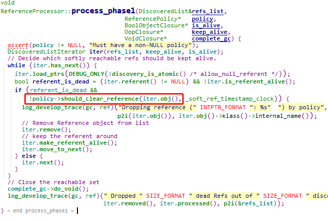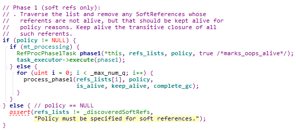 而在真正执行处理的process_phase1函数中,遍历所有软引用,对于不再存活的对象,通过前面提到的策略中的 process_discovered_references函数来判断该引用是需要保留还是从待清理的列表中移除。