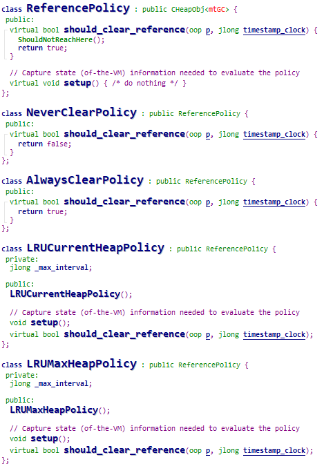 ReferencePolicy是一个基类,核心的虚函数should_clear_reference用于外界判断是否清理对应的引用。在HotSpot提供了四个子类用于引用的处理策略: