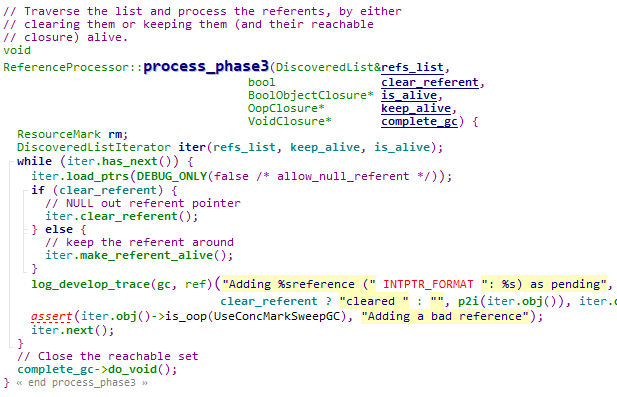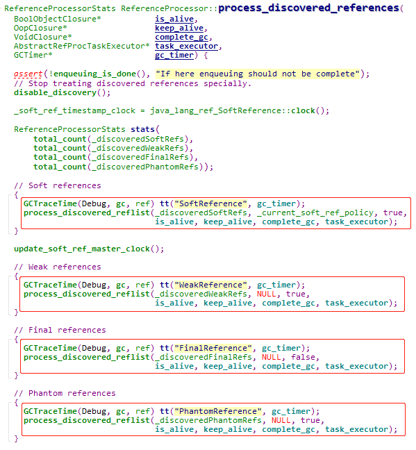 在HotSpot中,不管哪种垃圾回收器,在通过GC Roots遍历完所有的引用之后,在执行对象清理之前,都会调用ReferenceProcessor::process_discovered_references函数对找到需要清理的引用进行处理,这一点通过这个函数的名字也能看得出来。