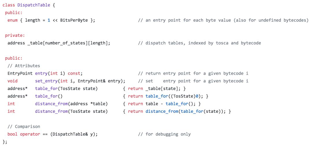 JVM虚拟机的执行过程简单理解就是一个超大的switch case,不断取出字节码然后执行该字节码对应的代码(这只是一个简化模型)。那JVM中肯定有一张用于记录字节码和其对应代码块信息的表,这个表叫DispatchTable,长这样: