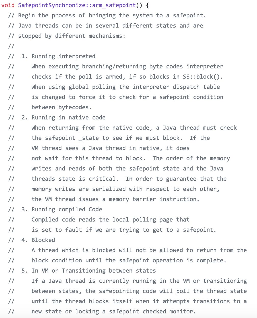 一个Java线程可能处于不同的状态,在HotSpot中,根据线程所处在不同的状态,让其进入安全点的方式也不尽相同。在HotSpot源码中有一大段注释对其进行了专门的说明: