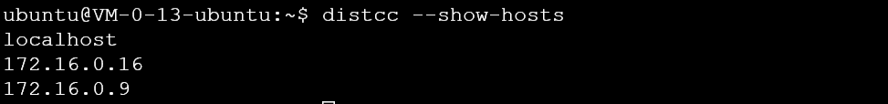 我们尝试用同一个子网中的三台服务器对Linux 4.19.90版内核做分布式编译。首先确定这三台服务器的内网ip分别为172.16.0.16、172.16.0.9和172.16.0.13,对应的hostname分别为VM-0-16-ubuntu、VM-0-9-ubuntu和VM-0-13-ubuntu。其中VM-0-16-ubuntu和VM-0-9-ubuntu有一个CPU核,而VM-0-13-ubuntu带有两个CPU核。