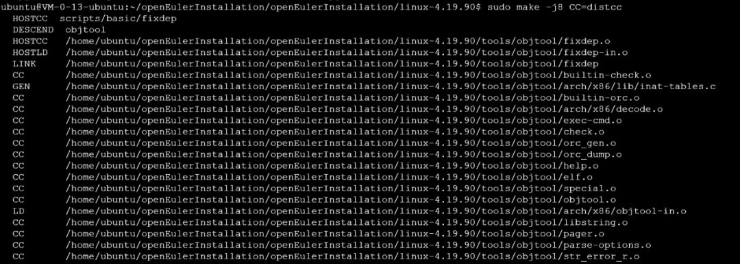 我们在三台服务器上都使用上一期中提到的脚本安装distcc,并将VM-0-16-ubuntu和VM-0-9-ubuntu作为server,而VM-0-13-ubuntu作为client 。将待编译的Linux 4.19.90内核源码放置在VM-0-13-ubuntu上,并按“Linux内核编程环境”小节中介绍的方法配置好编译环境。安装完的distcc文件夹如下图所示:
