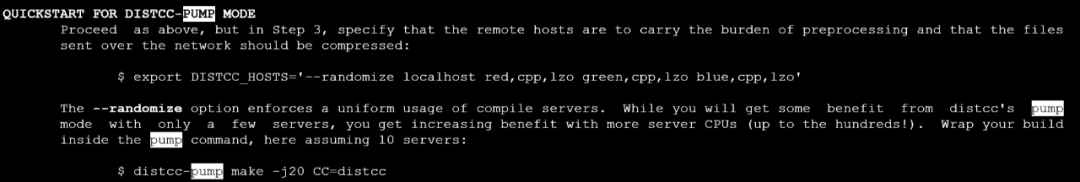 distcc是调用机器上安装的gcc进行编译的。其中使用的线程数建议是总的CPU数目的两倍。我们有4个CPU,因此使用了8个线程。在服务器CPU数目较多的时候,可以使用pump模式。pump模式的设置方法可以在源码包中的INSTALL文件中看到,或者使用man distccd命令。