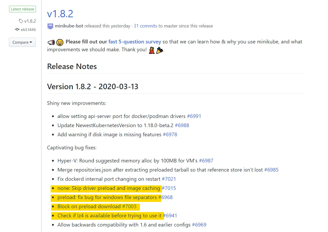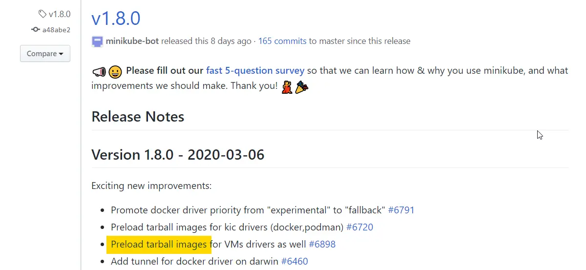 Minikube 最新的 1.8.2 和 1.7.3 对应的 Kubernetes 版本都是 1.17.3。使用旧版本启动集群需要额外下载的软件大小是这个 preload image 的一半,而且鉴于这个功能现在还貌似不够稳定,所以 推荐 使用 1.7.3 版本的 minikube。