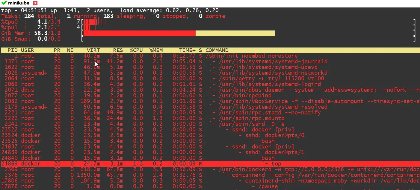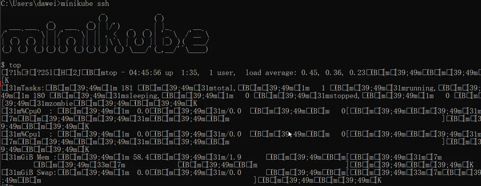 在命令行执行 minikube ssh 可以进入到虚机内部,但是因为终端类型的原因,会出现乱码,比如执行 top 命令: