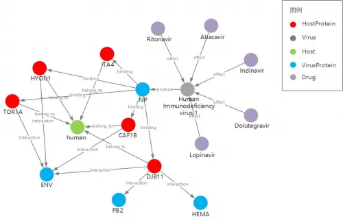 interaction和binding关系可以用于发现病毒蛋白与宿主蛋白间的相互作用,比如HIV1的NP(nucleoprotein)可binding在Human的HYOU1;之后可再补充某些药物和HYOU1间的target关系,进而可以研究这些药物和HIV1的NP(nucleoprotein)间的作用。