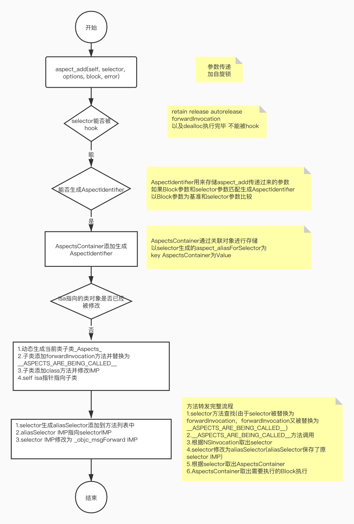 Aspect就是通过动态的生成当前类的子类,并且修改对象的isa指针指向生成的子类,这样方法寻址从子类的方法列表开始寻址,修改子类的方法列表也并不会影响原有类。