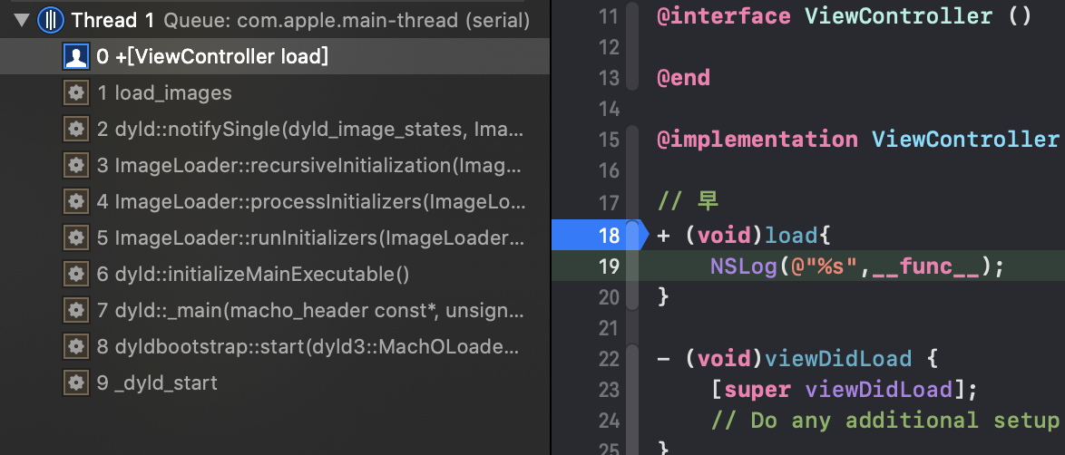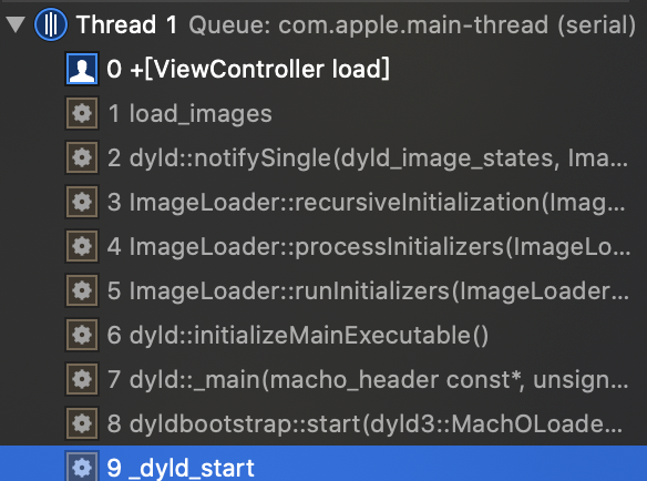 我们知道load在main函数之前,给它下一个断点,查看函数调用栈