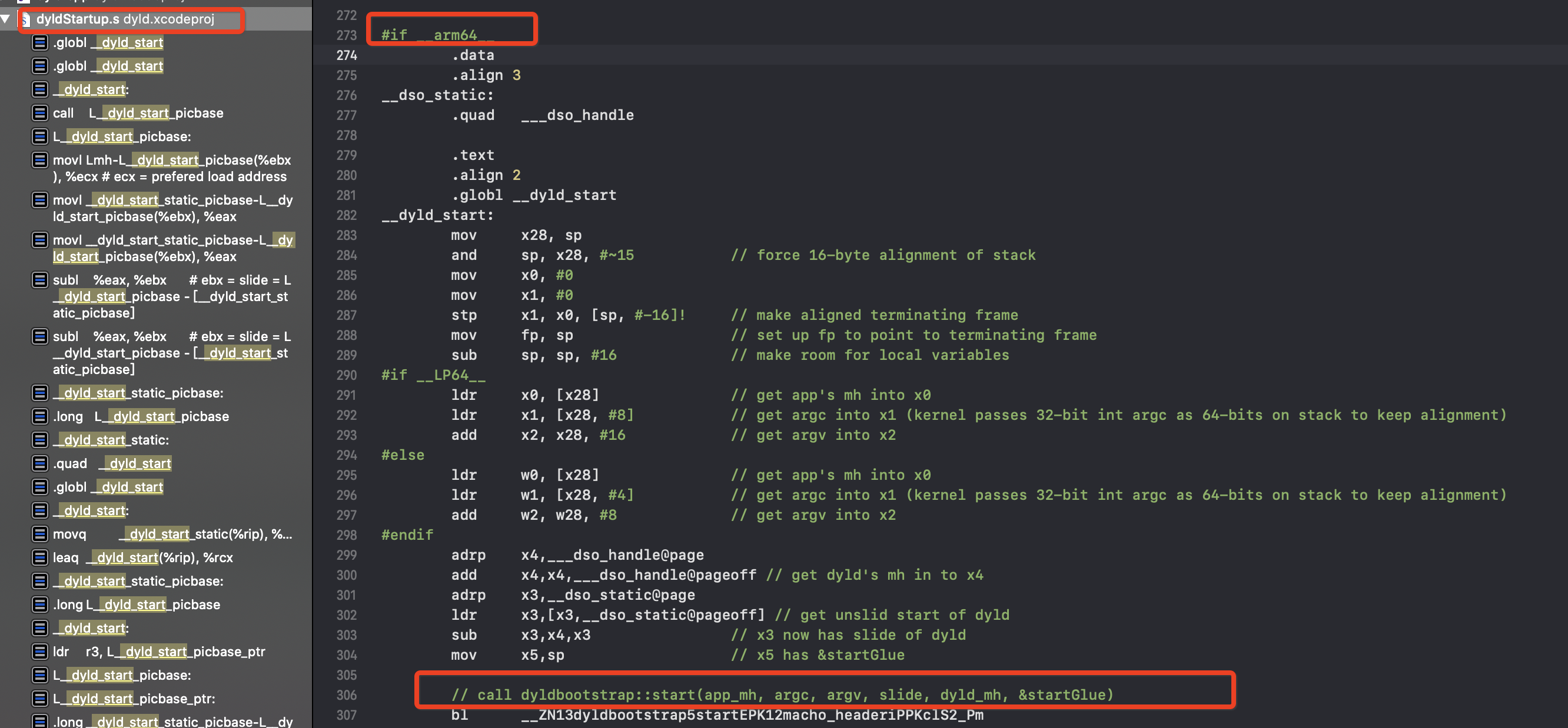 在源码中全局搜索_dyld_start,在dyldStartup.s找到,它是由汇编实现的,查看arm64的源码