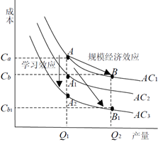 如图所示, 在供给方规模经济和需求方规模经济的双重作用下,IT产业中企业的经济规模和经济效率的最佳点有可能趋向于无边界,从而市场会表现出“一边倒”、“冒尖儿”的特征,市场均衡的结果会向某一产品或技术集中,集中的结果是市场结构不断地向垄断或寡占的市场结构转变。