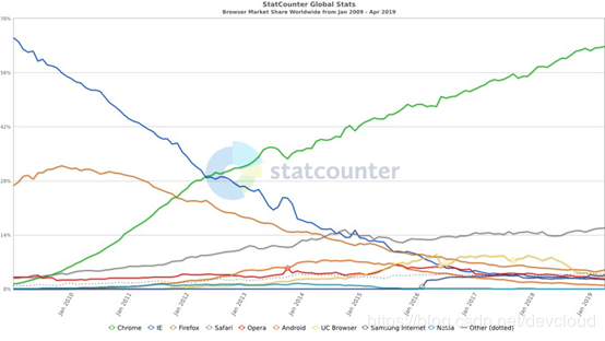 一切都在 Google 发布 Chrome 浏览器的时候改变了。在 Chrome 发布(2008 年 9 月)的前几个月, IE 占有超过 60%。而在 StatCounter 的 2019 年 1 月报告里,Chrome 占有超过 70的份额%。