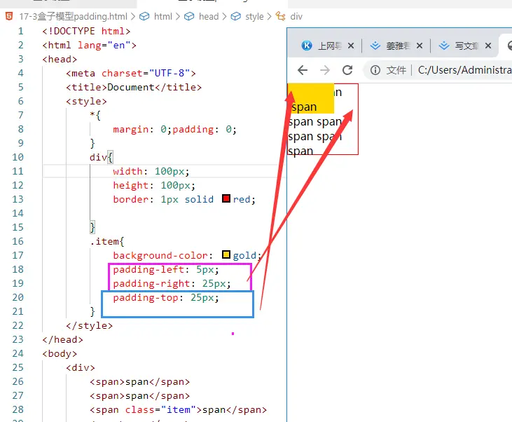 盒子模型----padding 姜雅君 2020-03-20 153 阅读1分钟 盒子模型深入padding(内边距) 对于块级元素来说, padding在四个方向都可以设置。 对于 行内元素 来说, padding在垂直(top/bottom)方向上是不影响网页空间的, 水平(left/right )方向还是影响网页的空间。